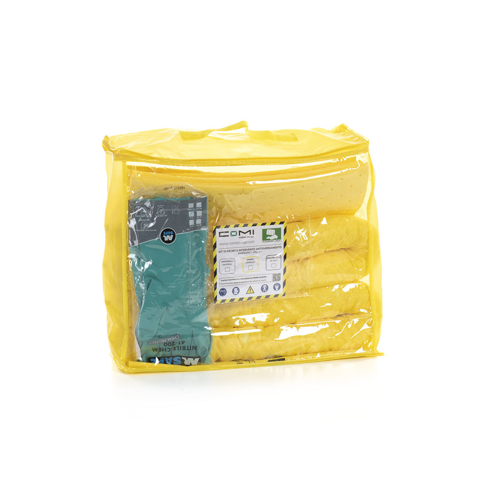 I kit di pronto intervento sono composti da una serie di componenti che permettono di avere una risposta rapida e immediata in caso di fuoriuscite di qualsiasi tipologia di liquido. Gli assorbenti presenti sono specifici per la raccolta di liquidi a base acquea, petrolifera, ibrida e naturale, come oli, idrocarburi, solventi, benzina, gasolio, grassi, acidi, basici, alcali, detergenti e gas disciolti in acqua.